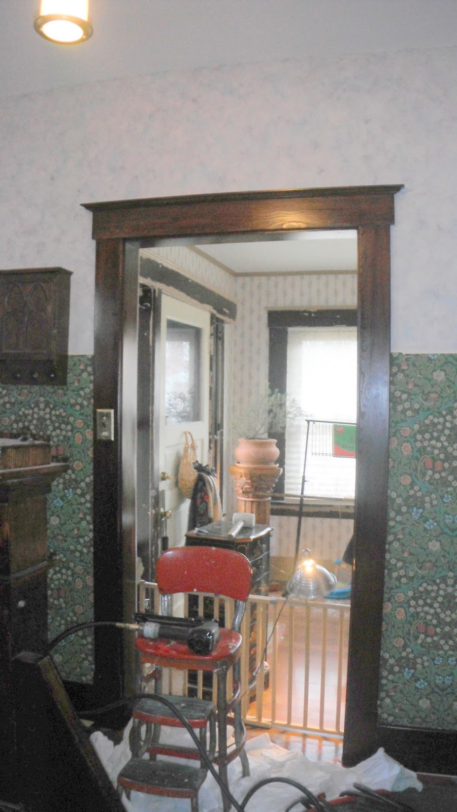 Other than that, Thursday and today, the jollification has been with the face trim in the northwest corner, between the portal to the living room and the doorway to the kitchen. It was a bit of a Chinese puzzle, how it was all supposed to go back together, and I was glad I took pictures back in 2008 when I took it down. There ensued a saga of blocking and shimming which I won't bore you with (though I have to say it amused me to be putting the original blocking back in, especially the pieces I used to test shellac colors).. Some of it had to be done twice in the same place, when I realized (in time, thank God) that what the woodwork needed for proper reassembly was not notching and cutting and trimming, but a bit more blocking and shims behind a piece I'd already nailed up.
